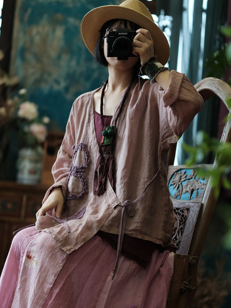 這款復古夏季吊帶苧麻襯衫採用 100% 苧麻麵料精製而成,飾有華麗的花朵圖案,是任何時尚前衛女性的必備品。這款襯衫採用經典 V 領和全插肩袖,散發出永恆的優雅氣息,非常適合春夏穿著。