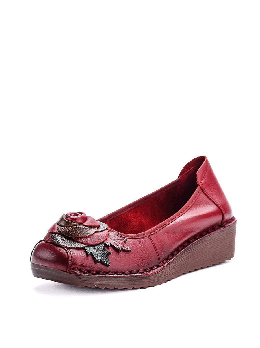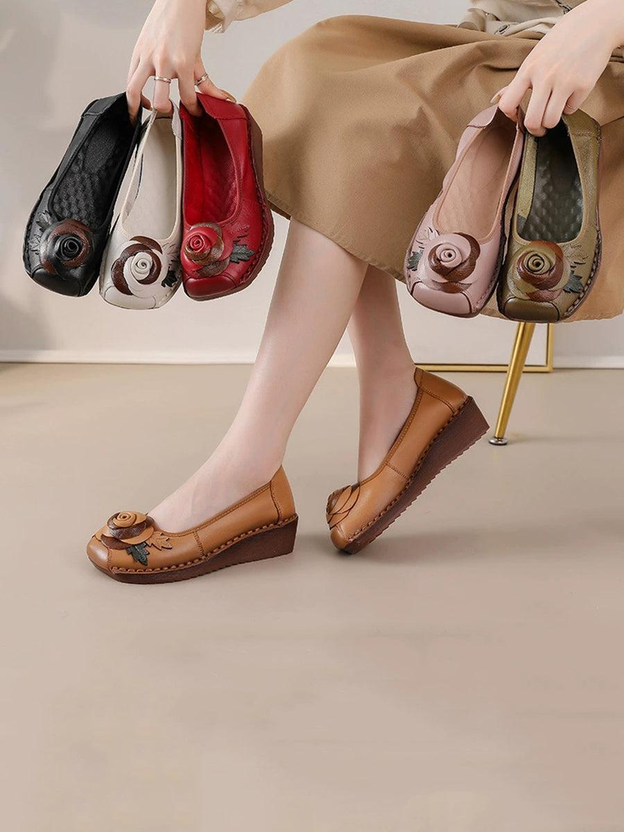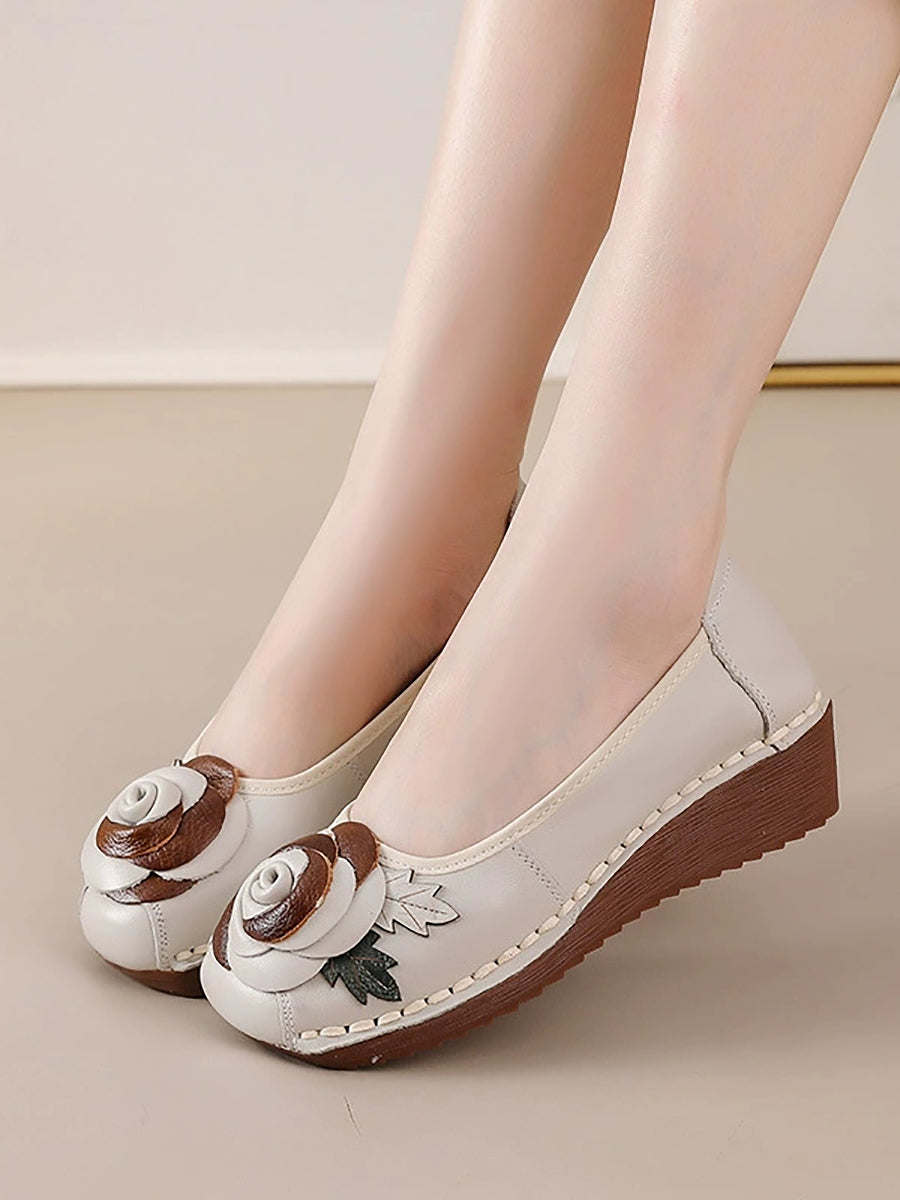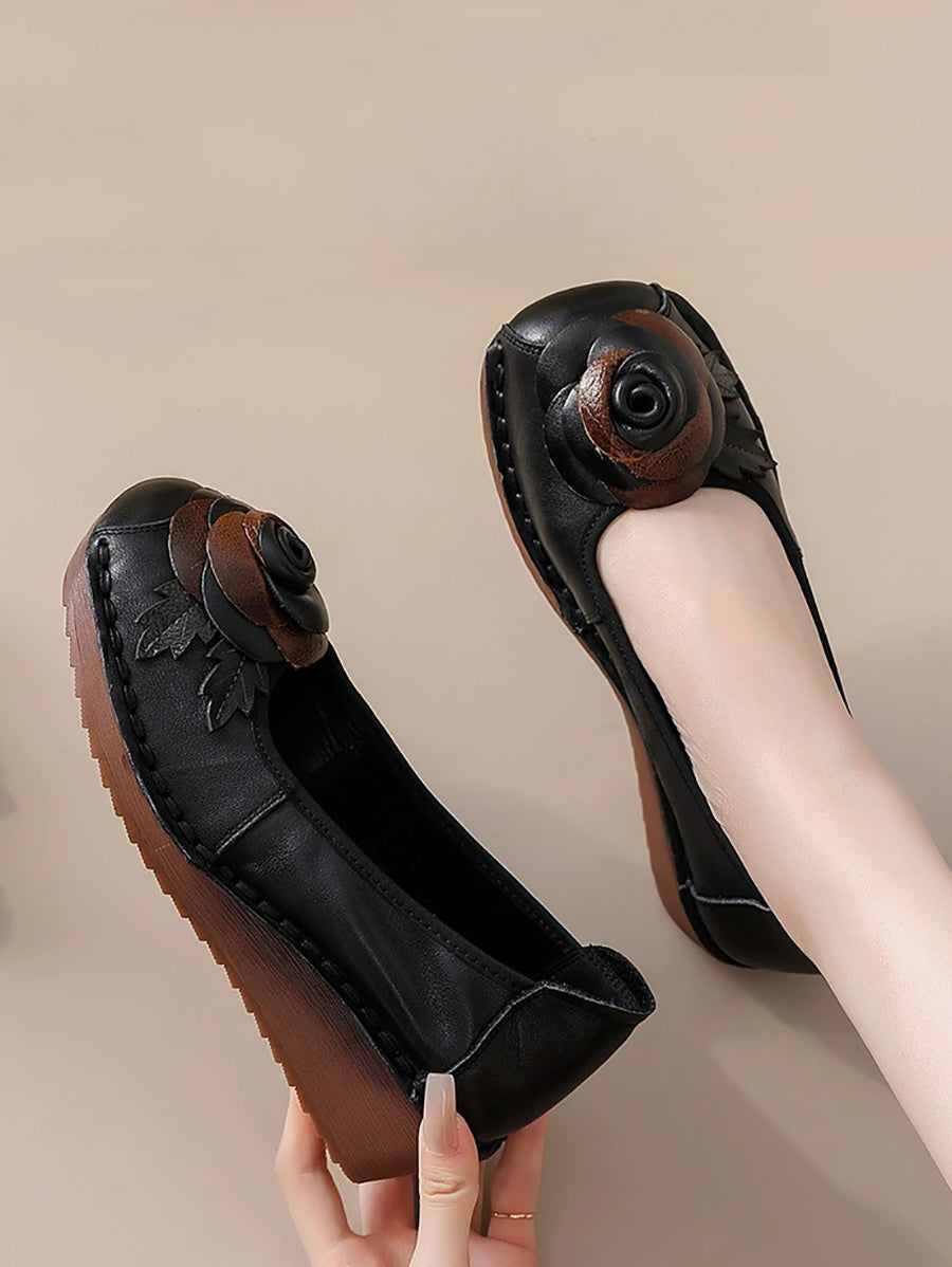 女士復古真皮花朵厚底鞋