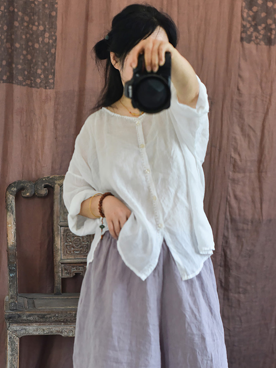 這款女款復古純色夏季拼接襯衫採用純色圖案。它有圓領、全插肩袖,復古風格非常適合春夏季節。