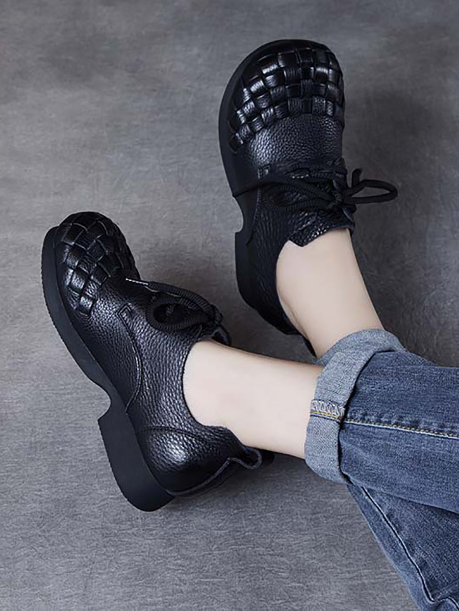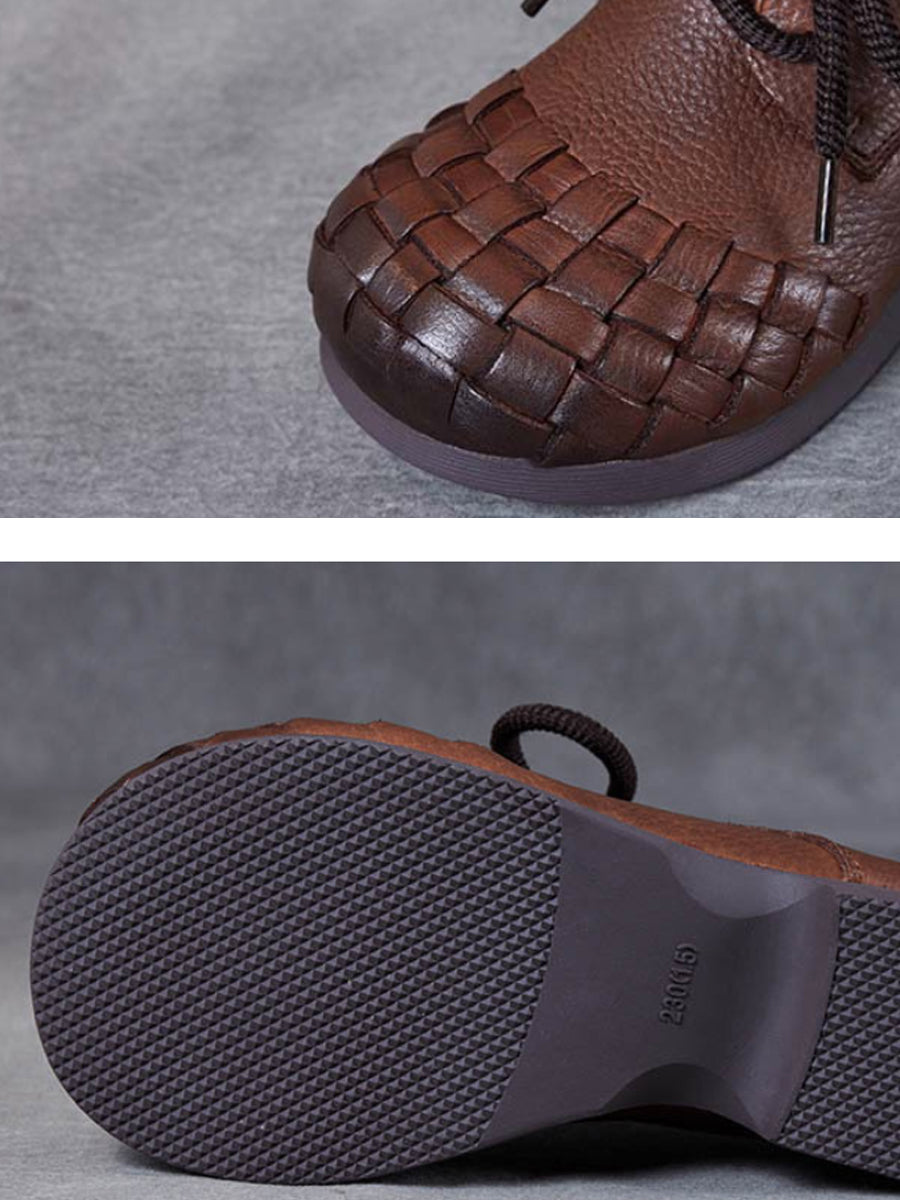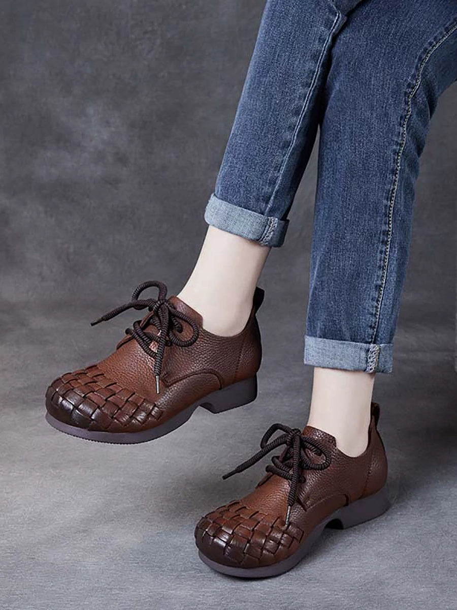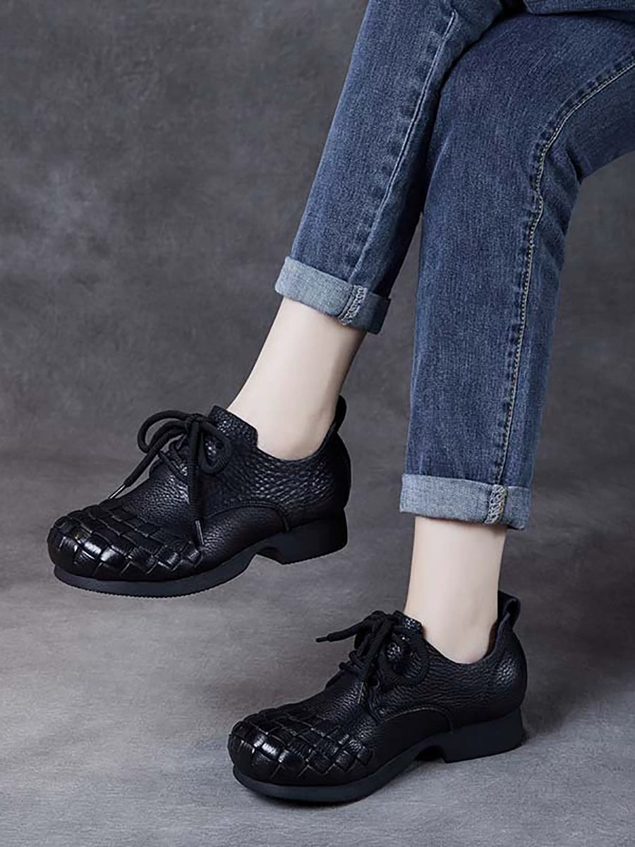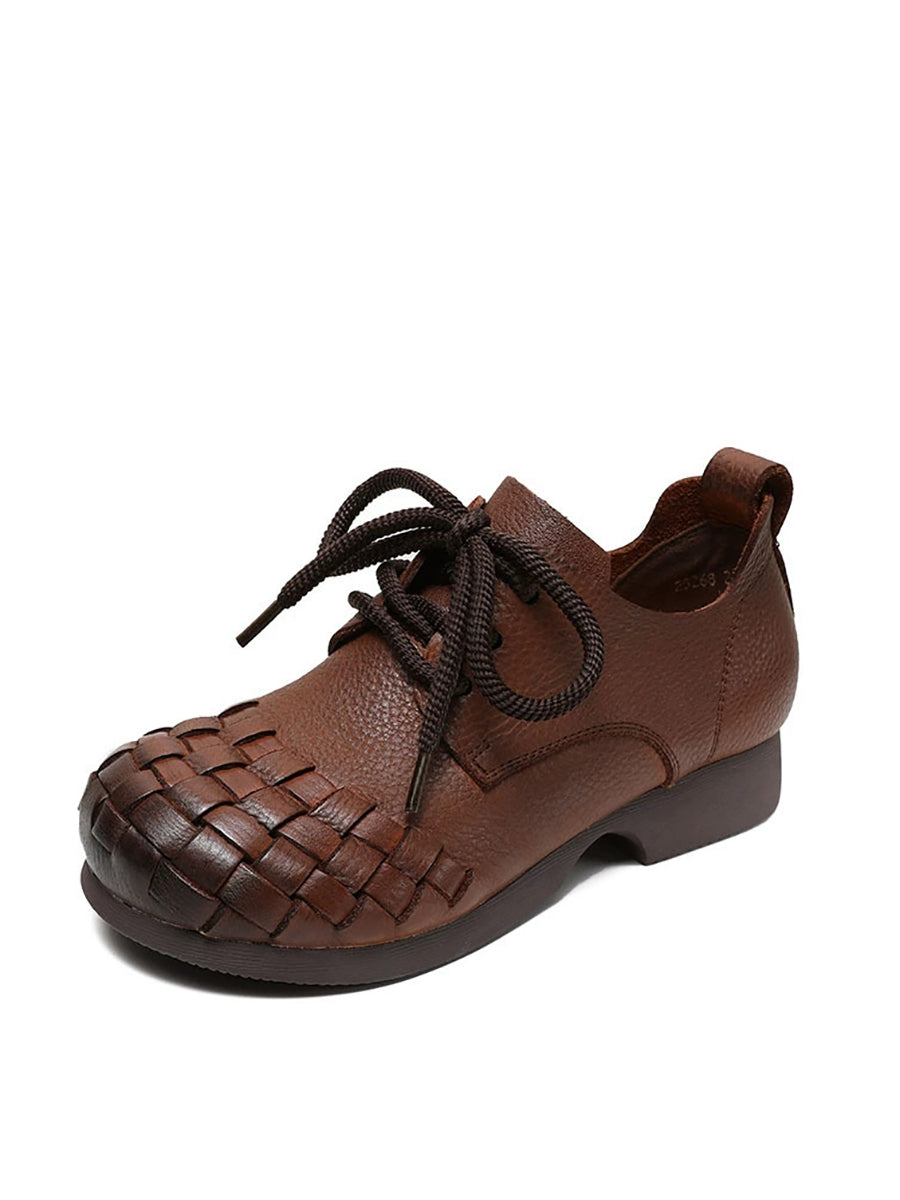 女士復古軟皮編織低跟鞋