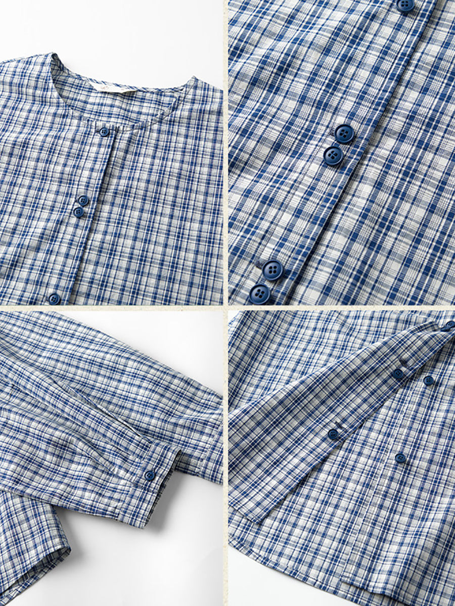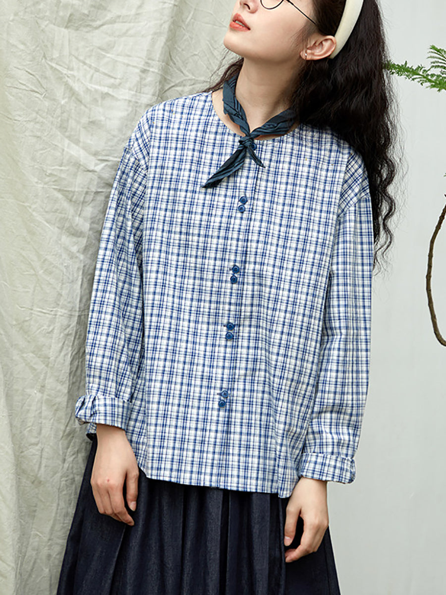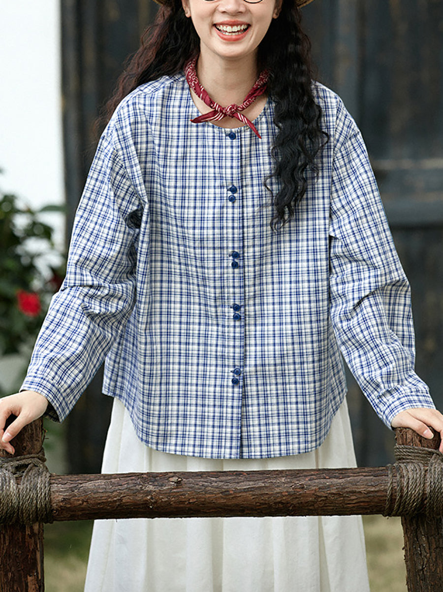 女士復古春季格紋圓領100%純棉襯衫