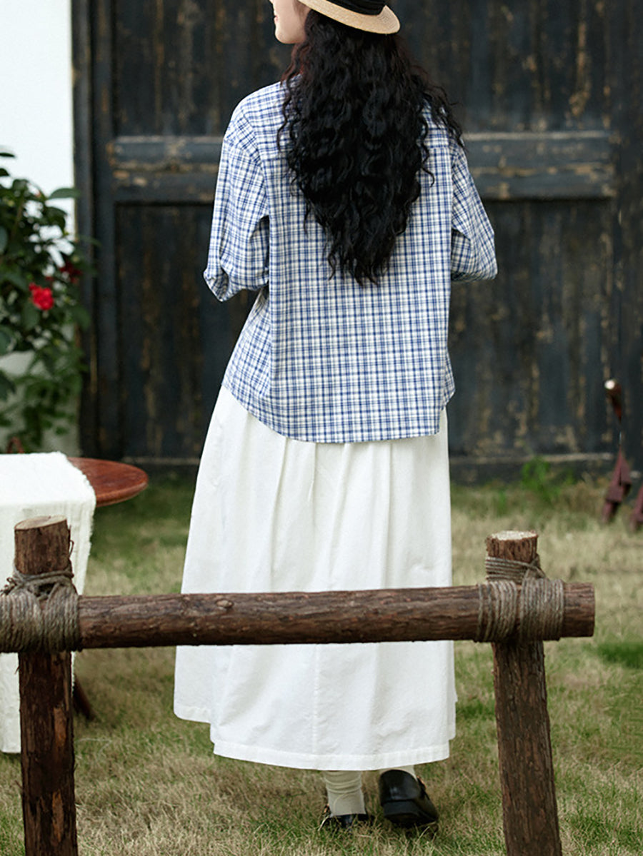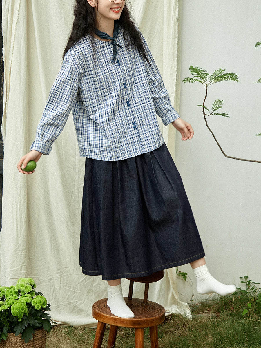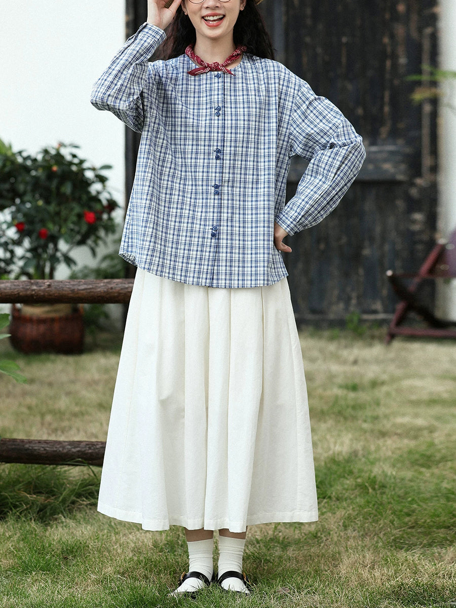 女士復古春季格紋圓領100%純棉襯衫