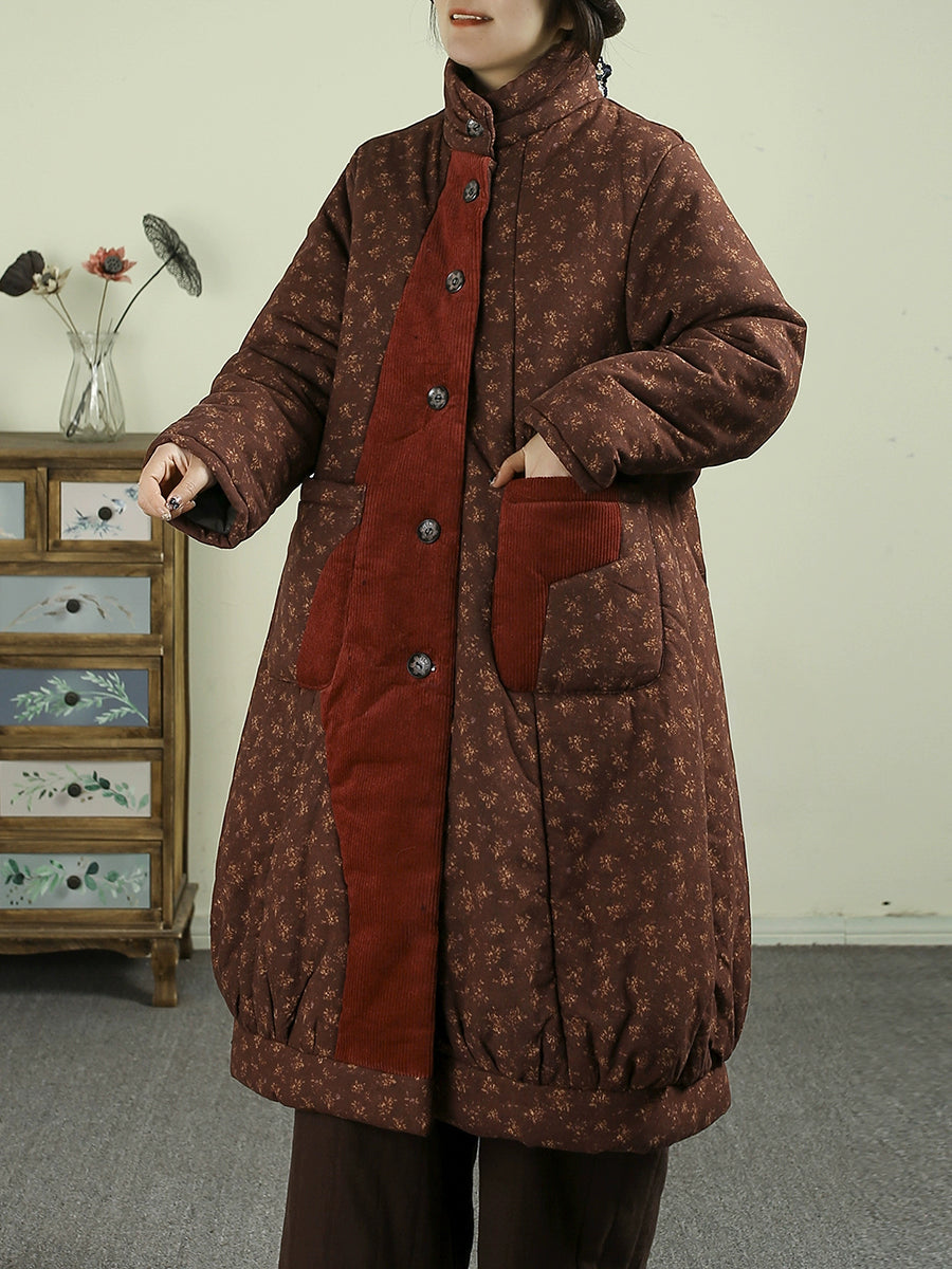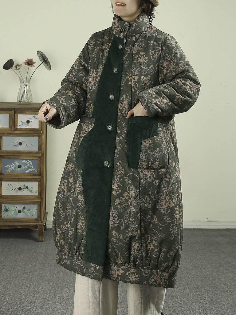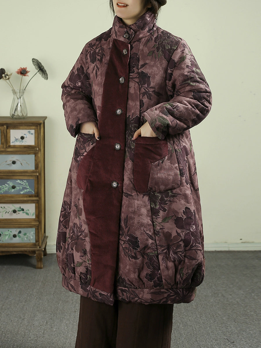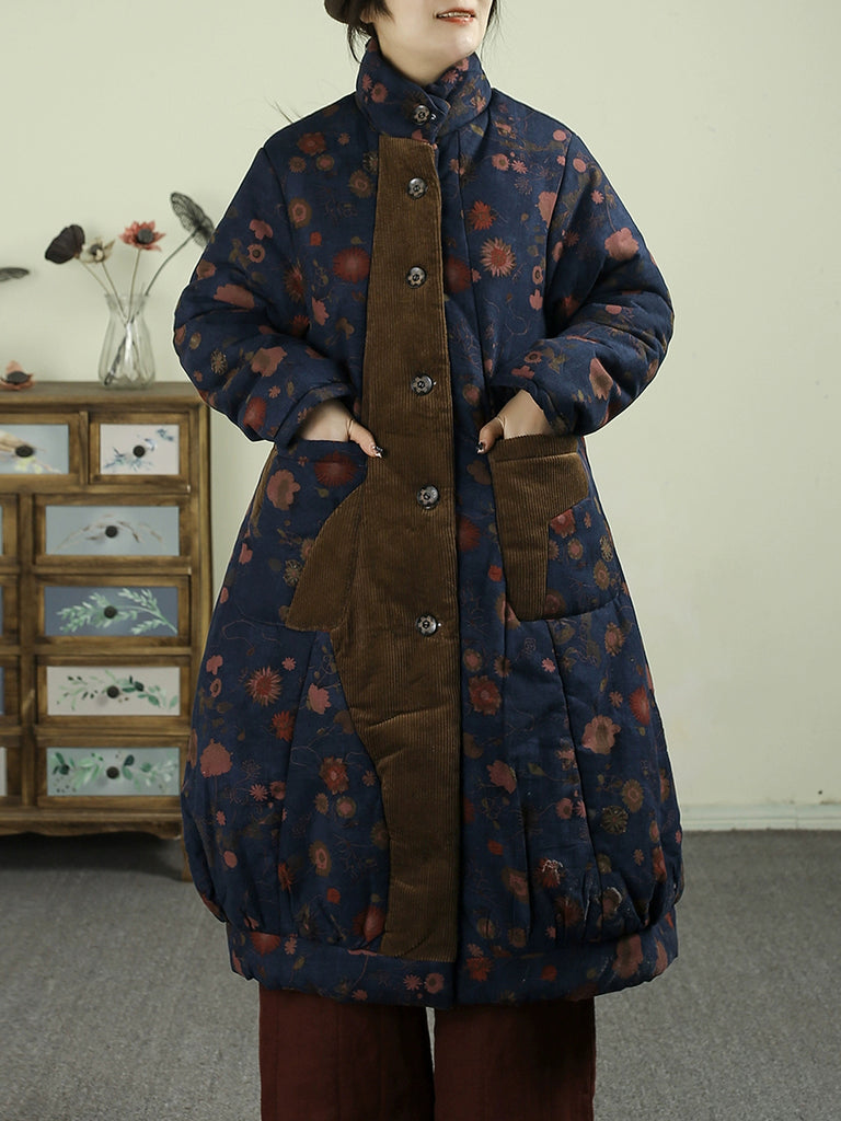 女士冬季花朵燈芯絨拼接立領羽絨服