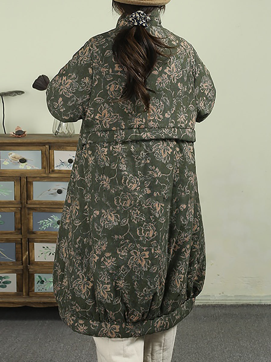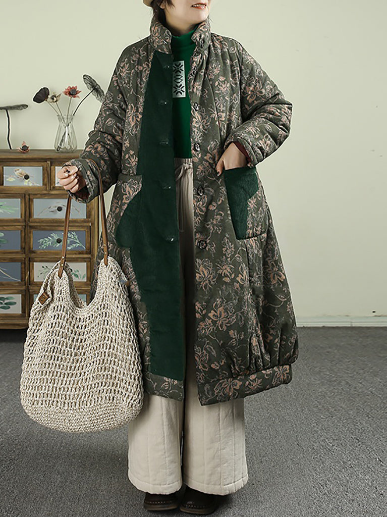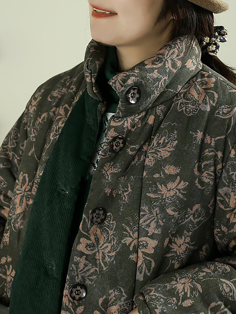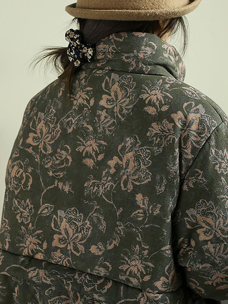女士冬季花朵燈芯絨拼接立領羽絨服