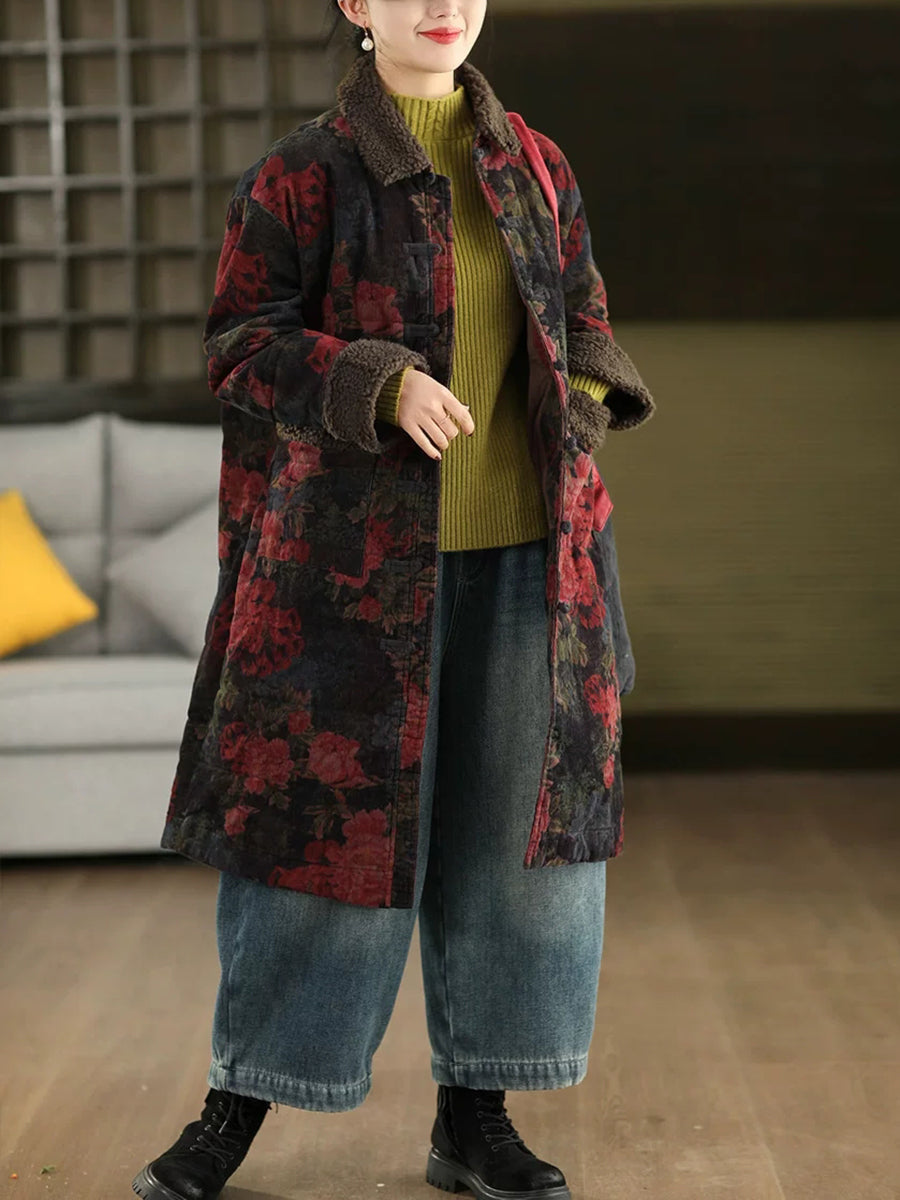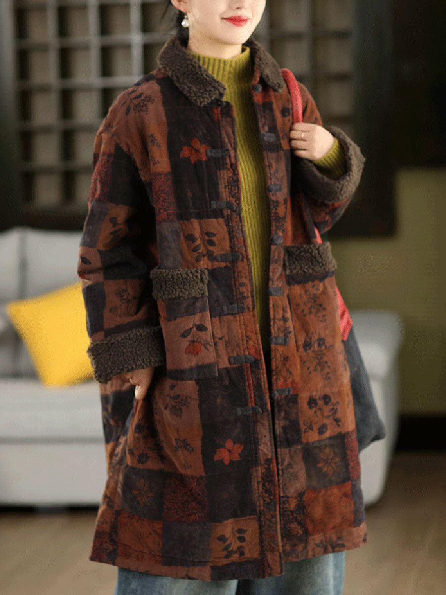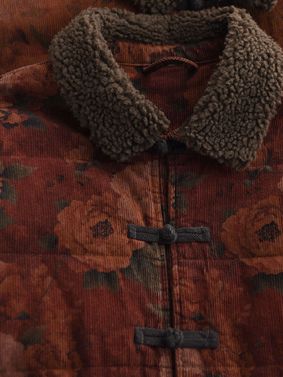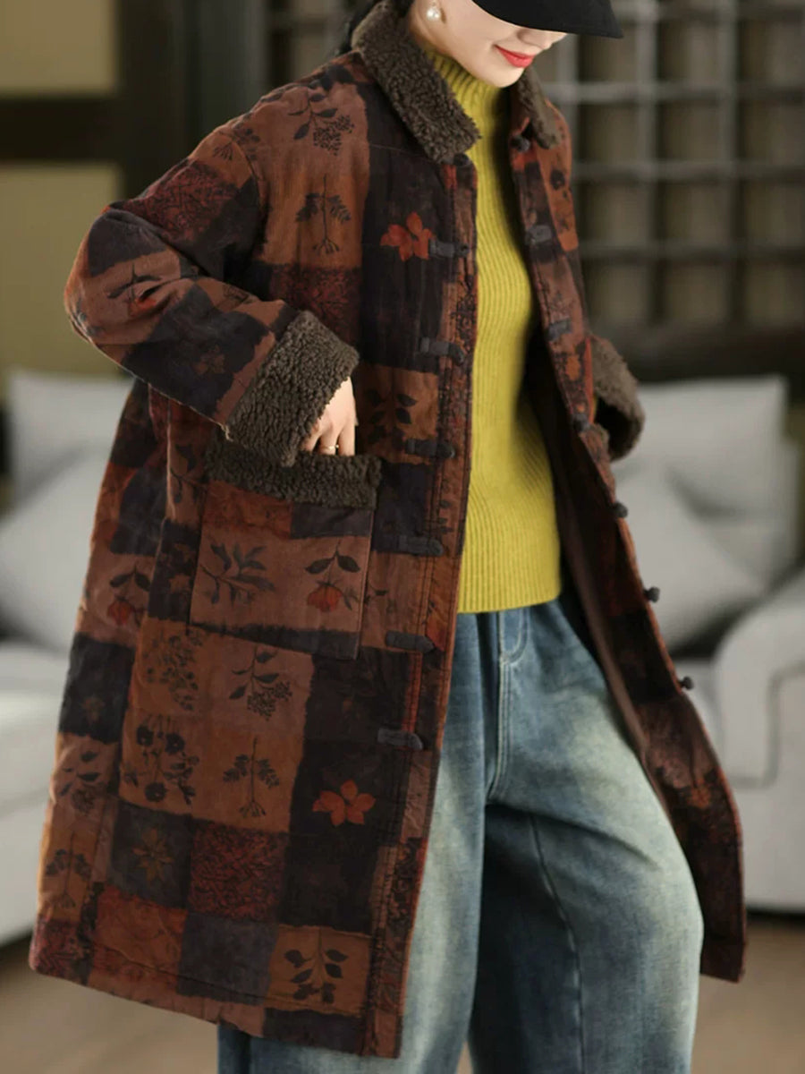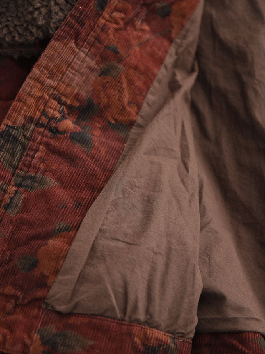 女士冬季復古碎花抓絨拼接燈芯絨外套