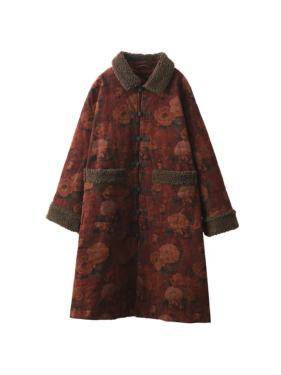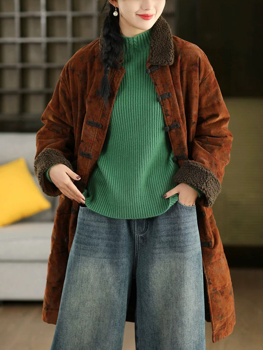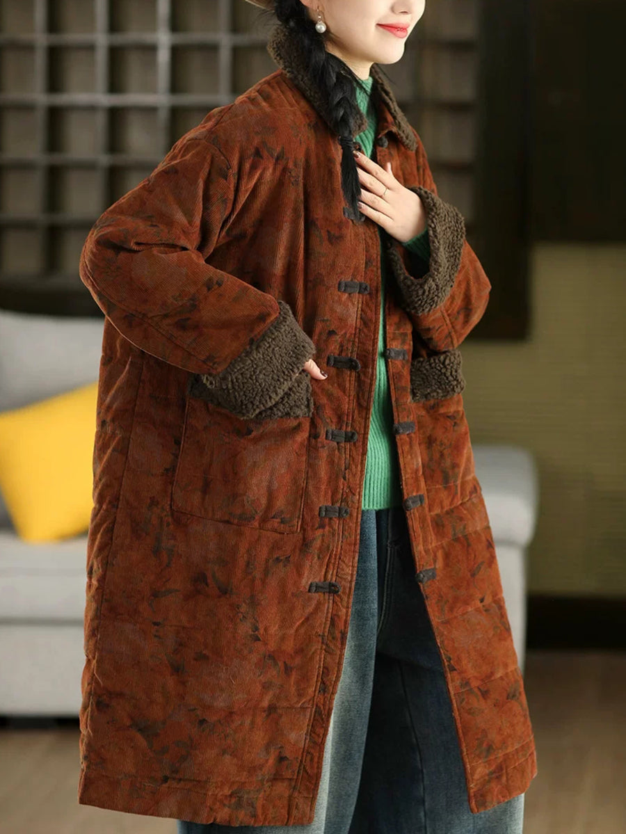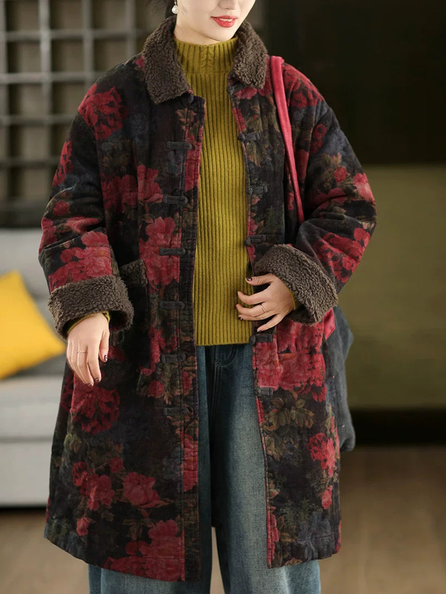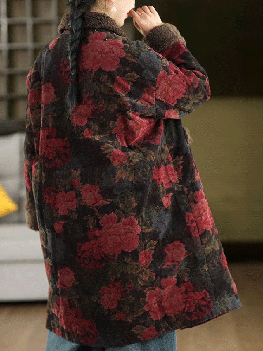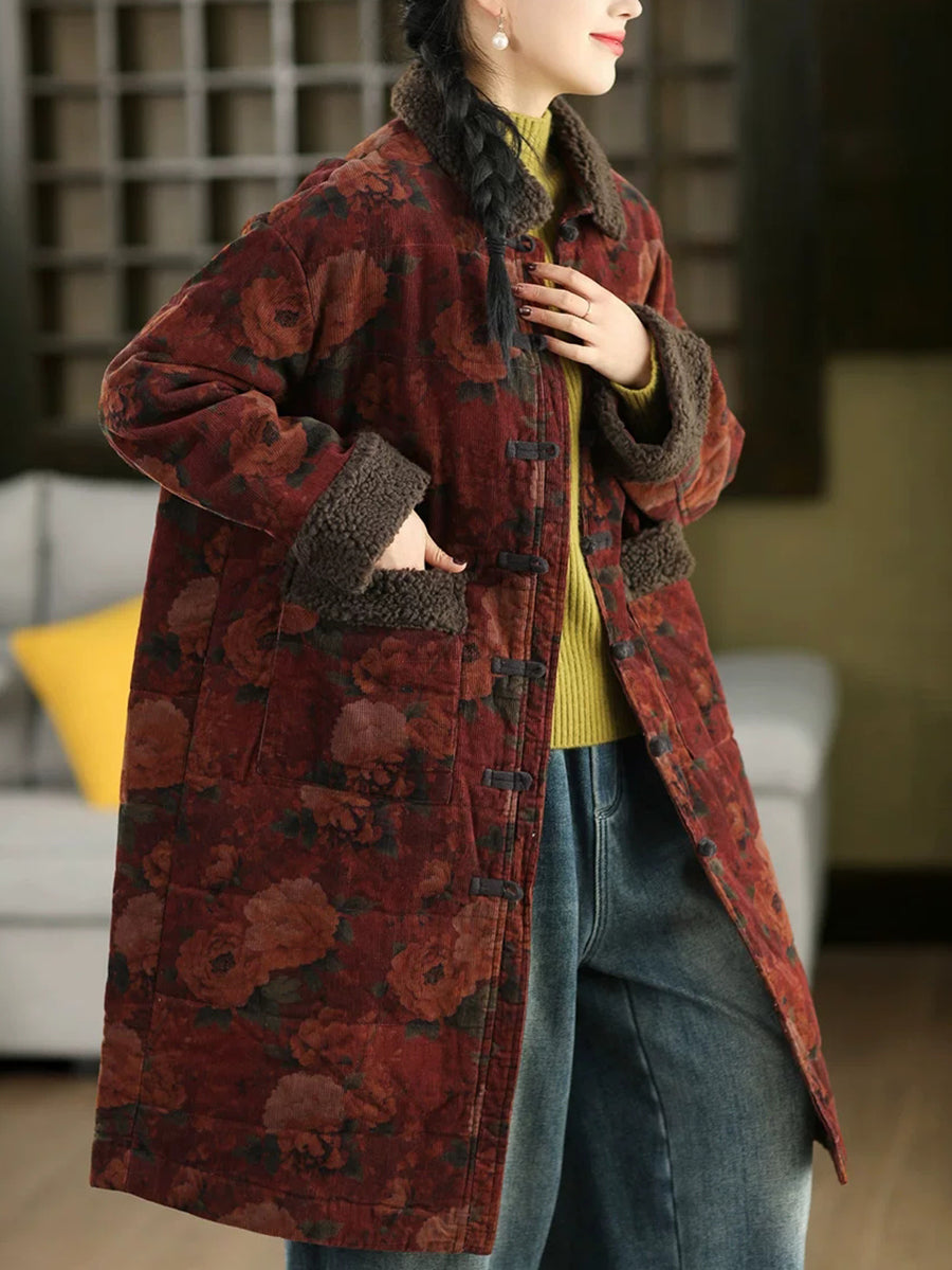 女士冬季復古碎花抓絨拼接燈芯絨外套