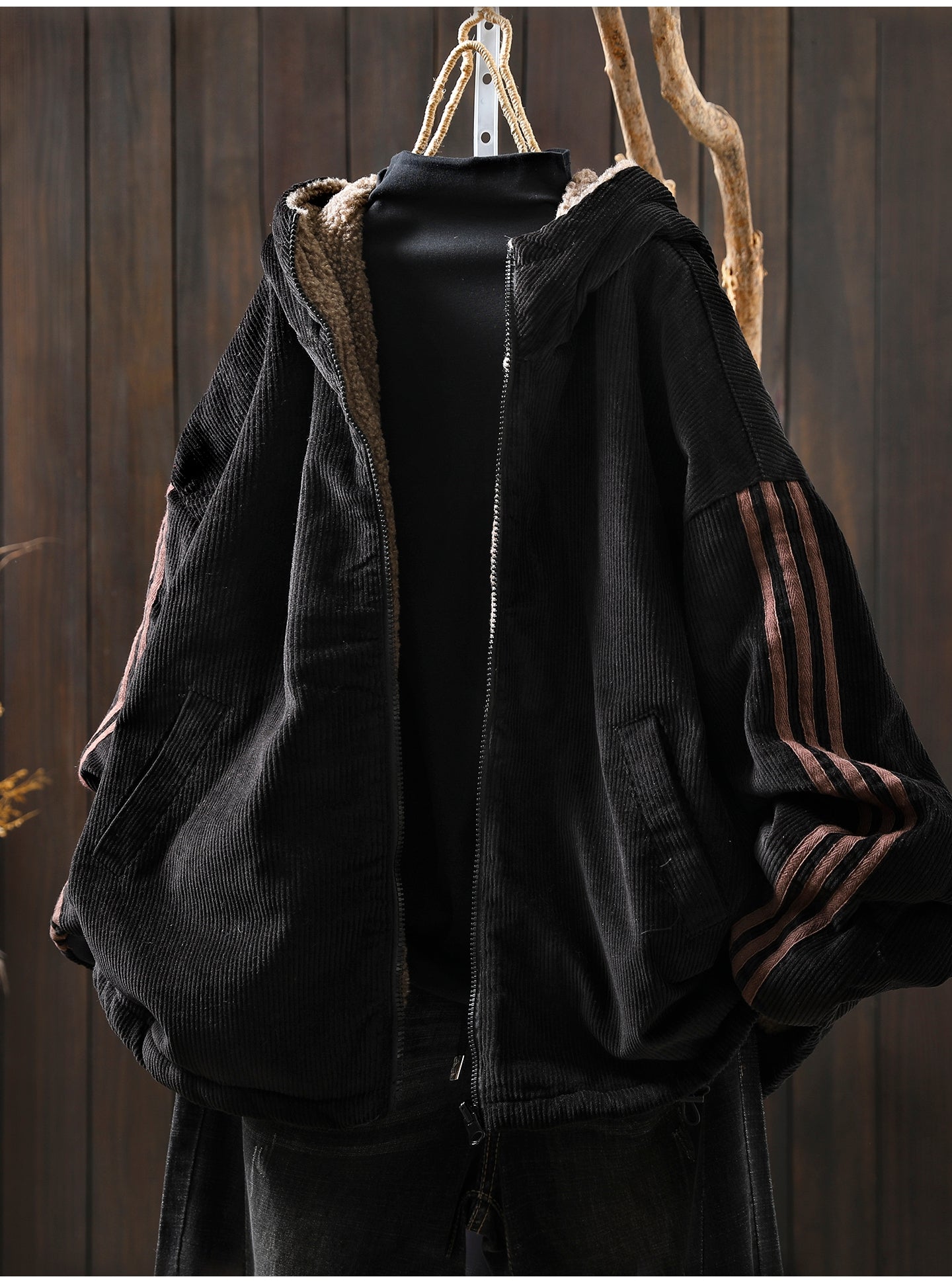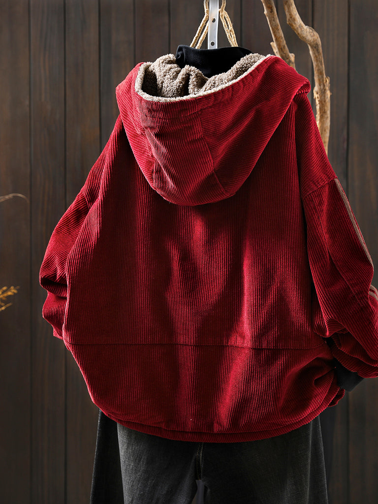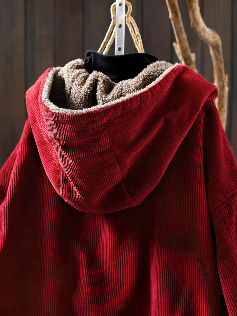 女士冬季復古純色加絨燈芯絨連帽外套