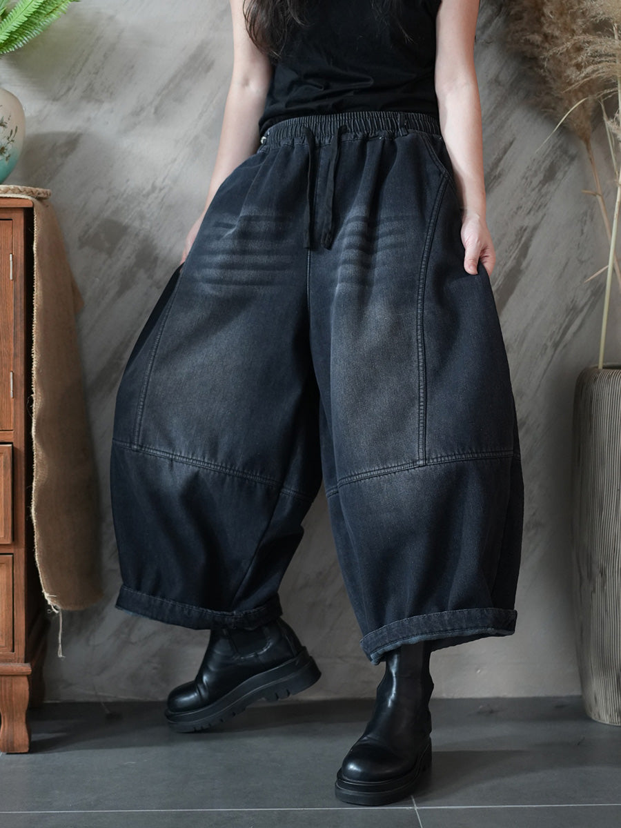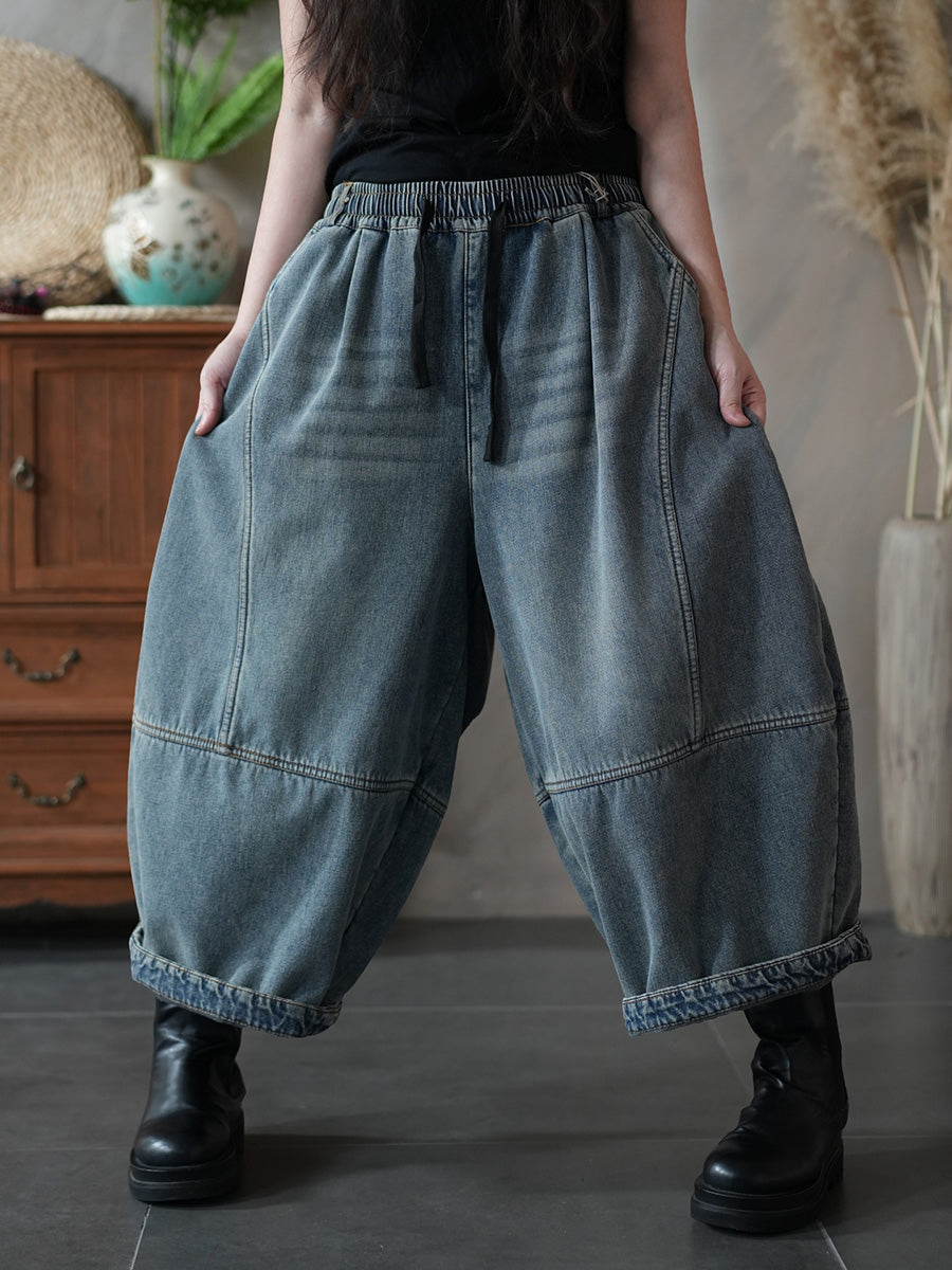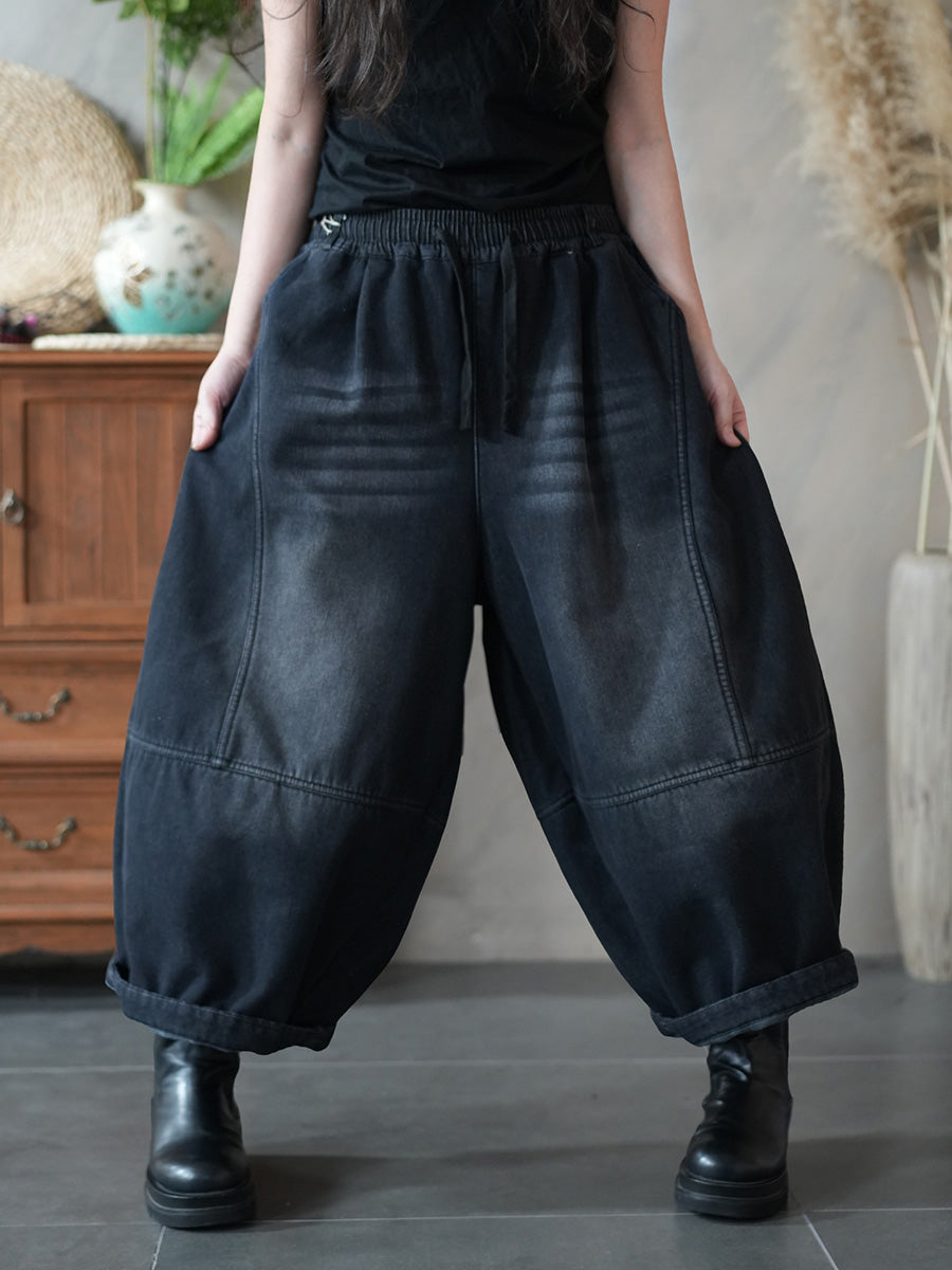 女士冬季復古純色加絨牛仔哈倫褲