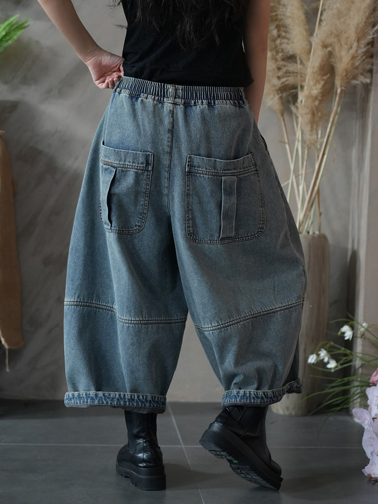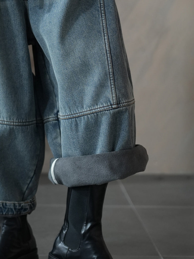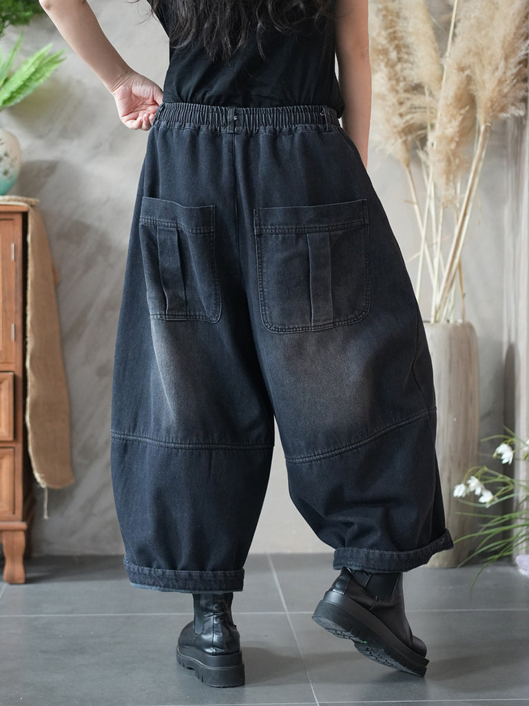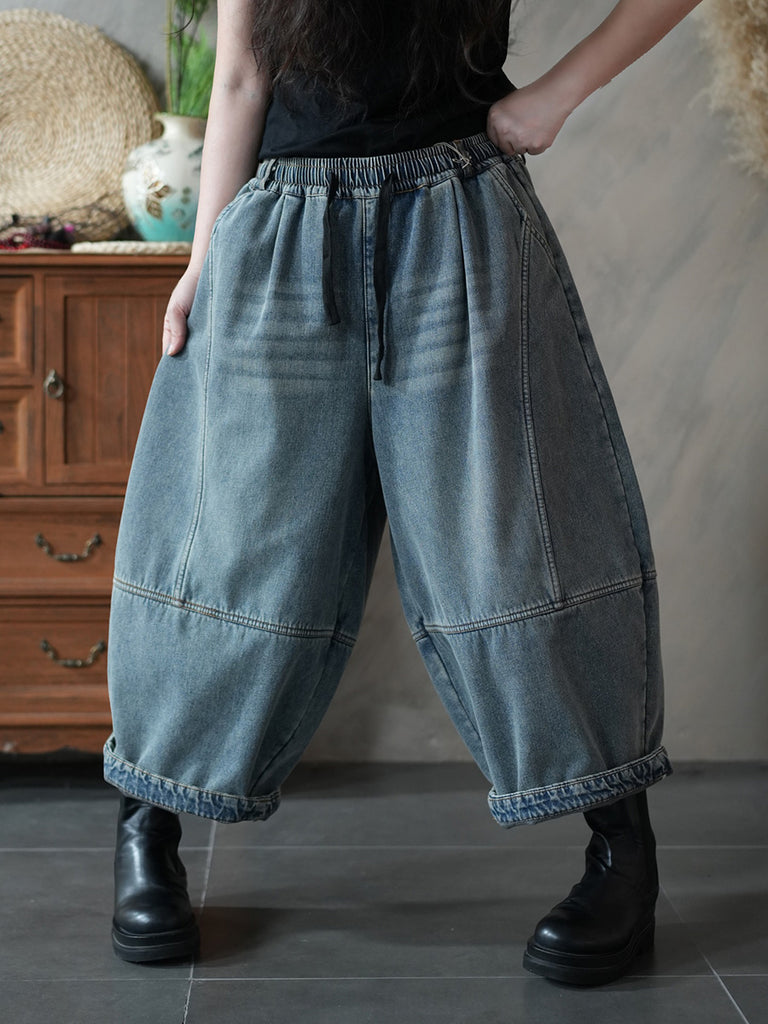 女士冬季復古純色加絨牛仔哈倫褲