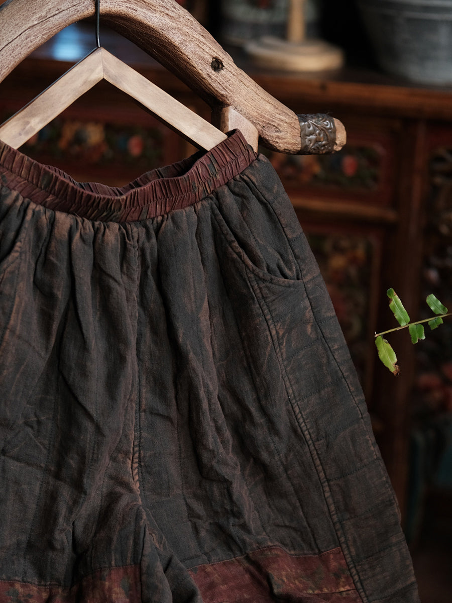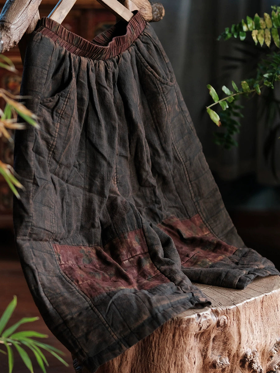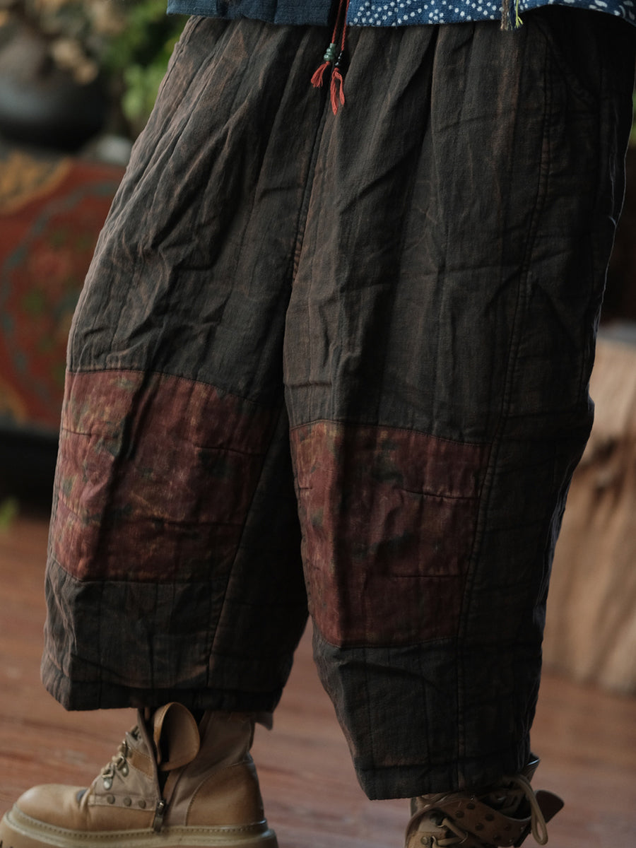 女士冬季復古亞麻拼接絎縫闊腿褲