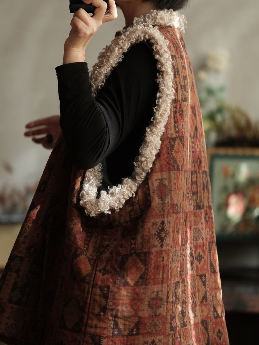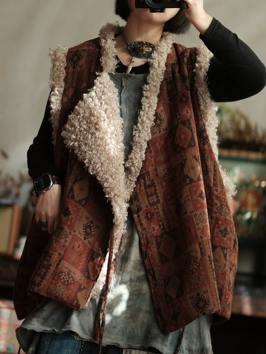 女士冬季復古拼接V領抓絨背心